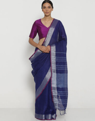 Dark Blue Linen Saree With Silver Border